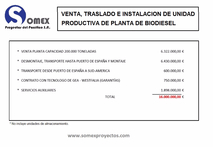 Si desea recibir la información completa de la planta de biodiesel puede enviar su petición a info@somexproyectos.com
